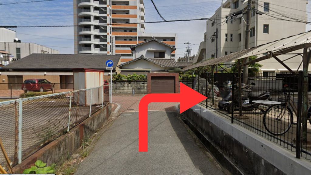 ※12月25日まで工事のため通行止めになっています。もう少し進んで次の角(学校の門の前)を右折、突き当りをまた右折してください。