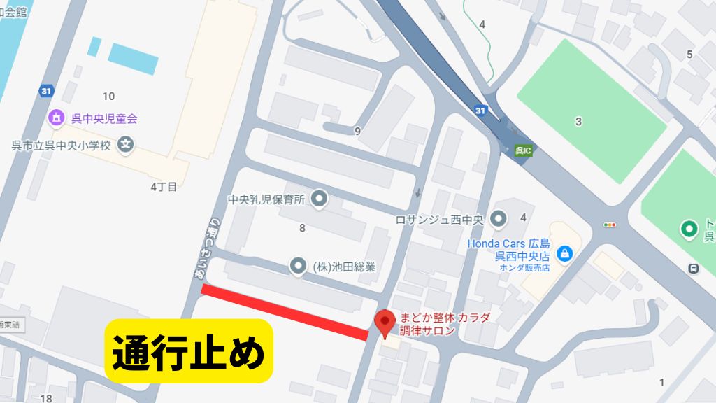 ↑ここで右折できないので、呉中央学園のグラウンドを左手に見ながら、そのまま直進して、正門前のT字路を右折してください。(道幅が狭いのでお気を付けください)
